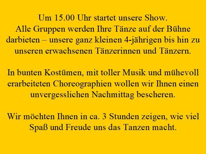 Wir sind inzwischen nicht mehr auf der Bühne zu sehen, halten uns aber immer noch fit. Unser Training findet montags von 20.00 - 21.30 in der Turnhalle der Goethe Schule Sangerhausen statt.